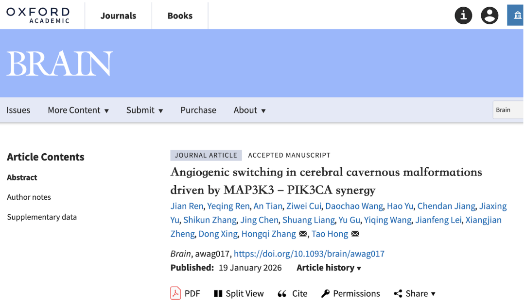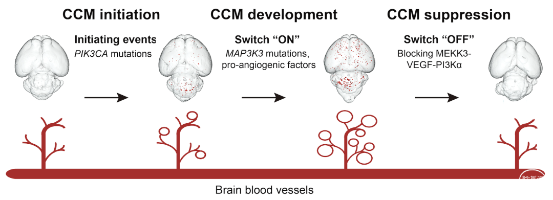 脑海绵状血管畸形(cerebral cavernous malformation,CCM)是中枢神经系统常见的出血性血管异常之一,是青壮年脑卒中和癫痫的重要致病因素。尽管其临床危害明确,但长期以来,散发性CCM “从何而来、为何进展”始终未明,近年来该疾病遗传机制的突破,开启了这一疾病从体细胞突变发生、发展到出血致病的系列机制研究。首都医科大学宣武医院神经外科洪韬、张鸿祺教授团队于2026年1月19日在Brain杂志发表题为"Angiogenic switching in cerebral cavernous malformations driven by MAP3K3-PIK3CA synergy"的研究论文。该研究揭示MAP3K3与PIK3CA突变协同激活PI3K–AKT–mTOR通路,诱导CCM中类似肿瘤的血管生成开关,并验证了PI3Kα抑制剂Alpelisib在CCM中的治疗潜力。