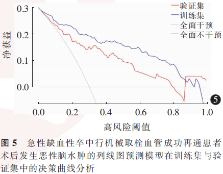 决策曲线分析结果显示,在训练集中,当阈值概率为0.00~0.91时,列线图模型可为预测AIS行机械取栓血管成功再通患者术后发生MBE提供临床净获益;而在验证集中,这一有效预测区间为0.04~0.78。见图5。