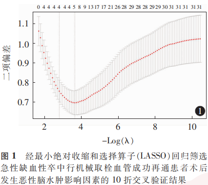 应用SPSS30.0及R4.5.0软件对数据进行统计学分析。采用Kolmogorov-Smirnov方法对计量资料进行正态性检验,符合正态分布的计量资料以x-±s表示,组间比较采用独立样本t检验;不符合正态分布的计量资料以中位数和四分位数[M(P25,P75)]表示,组间比较采用Mann-Whitney U非参数检验。计数资料以例(%)表示,组间比较采用χ2检验。以P<0.05为差异有统计学意义。以机械取栓后是否发生MBE为因变量,采用最小绝对收缩和选择算子(least absolute shrinkage and selection operator, LASSO)回归[通过10折交叉验证,根据1个标准误准则(λ.1SE)确定最优λ值]在训练集中筛选最具预测价值的变量并纳入多因素Logistic回归分析模型,以确定AIS行机械取栓血管成功再通患者术后发生MBE的独立危险因素,并计算其OR值和95%CI。基于训练集多因素Logistic回归模型中差异有统计学意义的因素绘制预测AIS行机械取栓血管成功再通患者术后发生MBE的列线图模型。采用受试者工作特征曲线(receiver operating characteristic curve, ROC)的曲线下面积(area under the curve, AUC)评价列线图模型在训练集与验证集中的预测效能。通过1000次 Bootstrap重采样方法绘制训练集和验证集校准曲线, 验证模型预测值与实际观测值的一致性, 以校准斜率≈1且截距≈0为佳;其中平均绝对误差< 0.05为模型校准极佳,0.05~0.10为校准良好,>0.10为校准不佳。分别在训练集与验证集中采用决策曲线分析列线图预测模型的临床适用性。