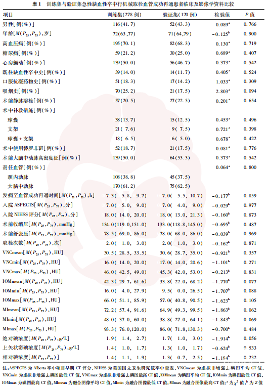 回顾性连续纳入2019年1月至2024年12月入住杭州市第一人民医院神经内科行机械取栓术血管成功再通的AIS患者,利用分层随机抽样法按照7∶3比例将所有患者分为训练集与验证集。本研究方案经杭州市第一人民医院医学伦理委员会审核批准(伦理审批号:IIT-20221212-0198-01)。所有患者或家属签署了诊疗知情同意书。