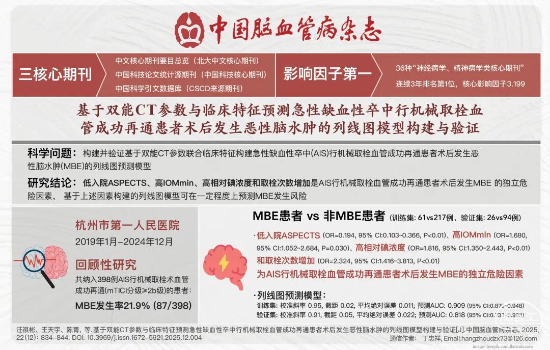 摘要:目的探讨基于双能CT参数联合临床特征构建急性缺血性卒中(AIS)行机械取栓血管成功再通患者术后发生恶性脑水肿(MBE)的列线图预测模型并验证。方法回顾性连续纳入2019年1月至2024年12月于杭州市第一人民医院神经内科行机械取栓术血管成功再通[术后即刻改良脑梗死溶栓(mTICI)分级≥2b级]的AIS患者,利用分层随机抽样法按照7∶3比例将所有患者分成训练集与验证集。收集所有患者的临床资料,其中基线资料包括性别、年龄、高血压病、糖尿病、心房颤动、既往缺血性卒中史、吸烟史、口服抗凝药物史、责任血管(颈内动脉、大脑中动脉)、术前大脑中动脉高密度征、入院美国国立卫生研究院卒中量表(NIHSS)评分、入院Alberta卒中项目早期CT评分(ASPECTS)、术前血压,治疗情况包括术前是否行静脉溶栓、术中是否采用补救措施(支架、球囊、支架+球囊)、术中是否使用替罗非班、取栓次数、发病至血管成功再通时间。所有患者在机械取栓术后1h内行双能CT平扫以明确是否存在脑实质内高密度区(PCHDs),记录并计算PCHDs上的绝对碘浓度及虚拟非增强(VNC)去碘图、碘图(IOM)、融合图像(MI)上的平均(mean)、最低(min)与最高(max)CT值(VNCmean、VNCmin、VNCmax、IOMmean、IOMmin、IOMmax、MImean、MImin、MImax),所有参数均测量3次,取平均值。相对碘浓度为绝对碘浓度与上矢状窦碘浓度的比值。术后72h内行CT平扫评估患者是否发生MBE。以机械取栓后是否发生MBE为因变量,采用最小绝对收缩和选择算子(LASSO)回归在训练集中筛选最具预测价值的变量并纳入多因素Logistic回归模型,以确定AIS行机械取栓血管成功再通患者术后发生MBE的独立危险因素,并绘制列线图预测模型。采用受试者工作特征曲线下面积(AUC)评价列线图模型在训练集与验证集中的预测效能,并在训练集和验证集中分别绘制校准曲线和决策曲线以评估模型预测值与实际观测值的一致性及其临床适用性。结果共纳入398例AIS行机械取栓血管成功再通患者,其中87例患者术后发生MBE,311例未发生MBE,MBE发生率为21.9%。训练集278例(MBE患者61例,非MBE患者217例),验证集120例(MBE患者26例,非MBE患者94例)。(1)训练集和验证集中患者的临床及影像学资料比较差异均无统计学意义(均P>0.05)。(2)基于LASSO回归在训练集中筛选变量并进行多因素Logistic回归分析,结果显示,低入院ASPECTS(OR=0.194, 95% CI:0.103~0.366, P<0.01)、高IOMmin(OR=1.680,95% CI:1.052 ~ 2.684,P=0.030)、高相对碘浓度(OR= 1.816,95% CI:1.350~2.443, P<0.01)、取栓次数增加(OR=2.324,95% CI:1.416~3.813, P<0.01)为AIS行机械取栓血管成功再通患者术后发生MBE的独立危险因素,基于上述因素构建AIS行机械取栓血管成功再通患者术后发生MBE的列线图预测模型,校准曲线分析显示,训练集中列线图预测模型校准极佳,校准斜率为0.95,截距为0.02,平均绝对误差为0.011;验证集中列线图预测模型校准极佳,校准斜率为0.91,截距为0.05,平均绝对误差为0.022;受试者工作特征曲线分析结果显示,在训练集中该列线图模型预测AIS行机械取栓血管成功再通患者术后发生MBE的AUC为0.909(95% CI:0.870~0.948),在验证集中的AUC为0.818(95% CI:0.733~0.903);决策曲线分析结果显示,在训练集中,当阈值概率为0.00~0.91时,列线图模型可为预测AIS行机械取栓血管成功再通患者术后发生MBE提供临床净获益;而在验证集中,这一有效预测区间为0.04~0.78。结论低入院ASPECTS、高IOMmin、高相对碘浓度和取栓次数增加是AIS行机械取栓血管成功再通患者术后发生MBE的独立危险因素,基于上述因素构建的列线图模型可在一定程度上预测MBE发生风险,为临床决策提供参考依据。