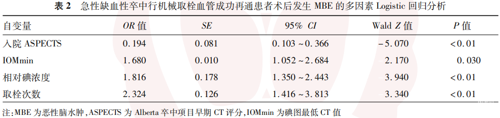 将LASSO回归筛选的4个预测变量纳入多因素Logistic回归模型,分析AIS患者行机械取栓血管成功再通后发生MBE的影响因素,结果显示,低入院ASPECTS、高IOMmin、高相对碘浓度、取栓次数增加均为AIS行机械取栓血管成功再通患者术后发生MBE的独立危险因素(均P<0.05)。见表2。
