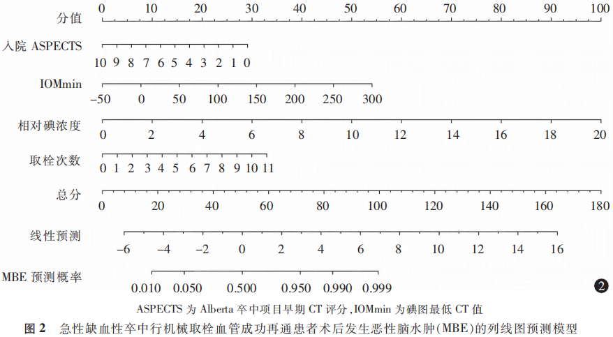 综上所述,低入院ASPECTS、高IOMmin、高相对碘浓度、取栓次数增加是AIS行机械取栓血管成功再通患者术后发生MBE的独立危险因素,基于其建立的列线图预测模型可有效评估AIS患者行机械取栓术后发生MBE的风险,具有一定的临床意义。