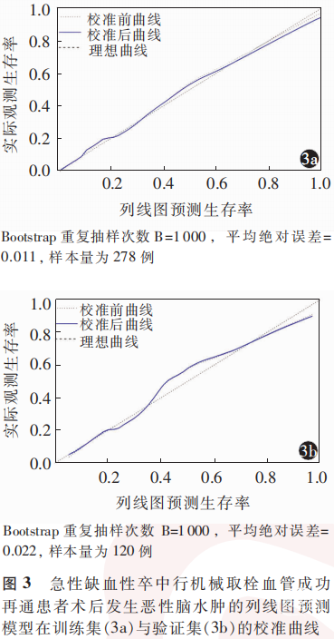 ROC曲线分析结果显示,在训练集中该列线图模型预测AIS行机械取栓血管成功再通患者术后发生MBE的AUC为0.909(95% CI:0.870~0.948),在验证集中的AUC为0.818(95% CI:0.733 ~ 0.903)。见图4。