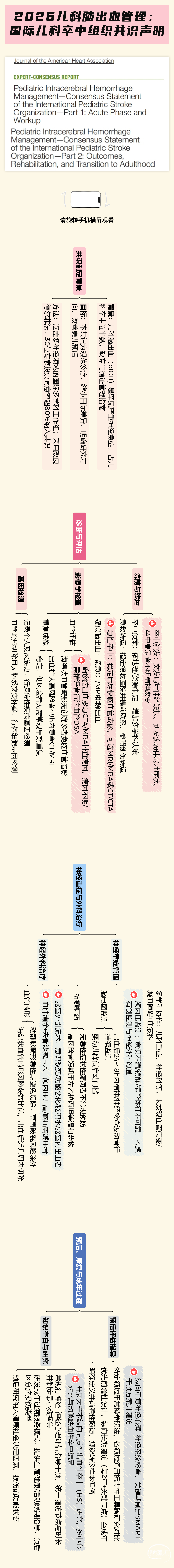 2、Mrakotsky C, Mailo JA, Chevignard M, et al. Pediatric Intracerebral Hemorrhage Management-Consensus Statement of the International Pediatric Stroke Organization-Part 2: Outcomes, Rehabilitation, and Transition to Adulthood. J Am Heart Assoc. 2026;15(1):e039595. doi:10.1161/JAHA.124.039595