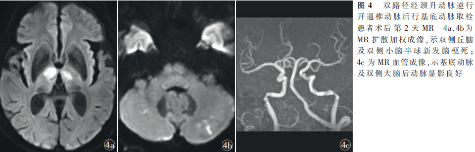 综上所述,经颈升动脉逆向开通闭塞的椎动脉行后循环串联病变取栓是可行的,可为顺向治疗困难的患者提供一种新的手术思路,但该手术方法的安全性及有效性有待更大样本研究证实。