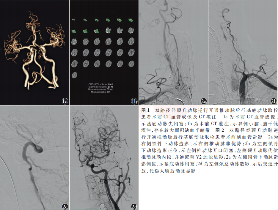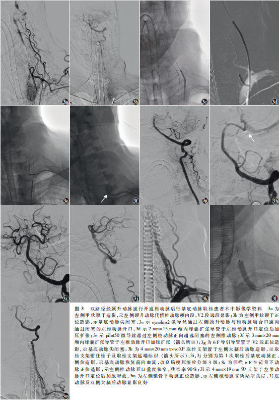 男,76岁,因“意识不清10h”于2022年8月5日18:12入住山东第二医科大学附属临沂市人民医院神经内科。患者于入院前10h突然出现意识不清,呼唤无反应,疼痛刺激可见皱眉,无发热、呕吐、肢体抽搐、大小便失禁。15:44于当地医院就诊,行脑血管造影见右侧椎动脉非优势,左侧椎动脉开口闭塞,诊断椎动脉闭塞性脑梗死,尝试行椎动脉机械取栓未成功,遂转入我院。患者既往高血压病史10年,平素不规律服药治疗;否认糖尿病、冠心病、卒中史。卒中门诊神经系统体格检查:浅昏迷,言语不合作,双侧眼球居中,双侧瞳孔直径3mm,对光反射灵敏;四肢肌力0级,四肢肌张力减低,双侧Babinski征阳性,美国国立卫生研究院卒中量表(NIHSS)评分31分;头部CT血管成像(CTA)、CT灌注示基底动脉尖闭塞(图1a),双侧小脑、脑干低灌注,存在较大面积缺血半暗带(图1b),诊断为脑梗死、基底动脉闭塞。拟行急诊血管内介入治疗。患者于2022年8月5日18:55全身麻醉后穿刺右侧股动脉,置入8F动脉鞘,送入5F单弯导管行双侧锁骨下动脉造影,示右侧椎动脉非优势(图2a),左侧椎动脉开口闭塞,未见明显残端,左侧颈升动脉代偿椎动脉颅内段显影,基底动脉显影差(图2b,2c),左侧颈总动脉造影示后交通开放,代偿大脑后动脉显影(图2d);单弯导管超选左侧锁骨下动脉,利用synchro2微导丝(0.014英寸×300cm;1英寸=2.54cm; Stryker,美国)尝试通过闭塞的左侧椎动脉,尝试数次未成功,遂将单弯导管超选左侧甲状颈干,造影示左侧颈升动脉代偿椎动脉颅内段,且椎动脉V2段可见逆向显影(图3a),动脉尖闭塞(图3b)。通过单弯导管送入synchro2微导丝+基底SL-10微导管(0.017英寸×150cm;Stryker,美国),通过左侧颈升动脉与椎动脉吻合口将微导丝送入椎动脉,同时逆行寻找椎动脉开口,成功将微导丝通过闭塞的椎动脉送至左侧锁骨下动脉(图3c);交换2mm×15mm颅内球囊扩张导管(普微森医疗科技有限公司),于椎动脉开口定位后加压至12个标准大气压扩张1次(图3d),球囊扩张过程中可见“束腰征”。此时穿刺左侧桡动脉,置入6F桡动脉鞘,沿鞘送入6F Envoy导引导管(0.070英寸;Cordis,美国)至左侧椎动脉开口附近,沿导引导管送入pilot50微导丝(0.014英寸×190cm;Abbott,美国)+ 3mm×20mm颅内球囊扩张导管(普微森医疗科技有限公司),以synchro2微导丝为参照顺向超选左侧椎动脉(图3e),pilot50微导丝顺利送至V2段;跟进球囊,于椎动脉开口加压至12个标准大气压扩张1次(图3f);撤出逆向synchro2微导丝,以pilot50微导丝及3mm×20mm颅内球囊扩张导管为支撑跟进导引导管至V2段;经6F导引导管造影证实基底动脉尖闭塞,断端平齐(图3g);撤出微导丝及球囊,沿导引导管送入synchro2微导丝+ prowler select plus微导管 (0.021英寸× 150cm;Cordis,美国),通过基底动脉闭塞段送至左侧大脑后动脉P2段,冒烟证实真腔;沿微导管置入trevoXP取栓支架(4mm×20mm;Stryker,美国)于闭塞段释放(图3h),支架锚定置入tracLine远端通路导管(5F;禾木生物工程有限公司)至闭塞段,负压下拉栓1次,见多枚血栓取出,即刻造影示基底动脉恢复前向血流,改良脑梗死溶栓(modified thrombolysis in cerebral infarction, mTICI)分级3级(图3i,3j)。穿刺至首次血管再通时间115min。回撤导引导管,造影示左侧椎动脉开口重度狭窄,狭窄率90%(图3k),给予替罗非班0.5mg/h静脉泵入抗血小板聚集,随后于椎动脉开口置入SD支架(4mm×19mm;波科,美国;图3l),即刻造影示支架完全覆盖病变,贴壁良好,基底动脉及双侧大脑后动脉血流通畅(图3m)。静脉泵入替罗非班48h后改阿司匹林联合氯吡格雷抗血小板聚集治疗并维持90d。术后第2天复查头部MR,扩散加权成像示双侧丘脑及双侧小脑半球新发脑梗死(图4a,4b),MR血管成像(MRA)示基底动脉及双侧大脑后动脉血流通畅(图4c)。术后4d患者病情稳定,神经系统体格检查:意识清楚,构音障碍,双侧瞳孔等大等圆,直径3mm,对光反射灵敏,双侧鼻唇沟对称,左侧肢体肌力Ⅳ级,右侧肢体肌力Ⅴ级,左侧Babinski征阳性,NIHSS评分5分;无穿刺点血肿、颅内出血等并发症。于2022年8月12日出院。术后90d电话随访,mRS评分1分。
