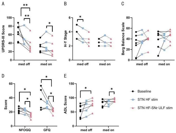 本研究为一项多中心、前瞻性、单盲临床试验,共纳入6名合并顽固性冻结步态的晚期PD患者。研究采用可实现触点独立参数设置的新型DBS系统,实施了高频STN(130–210 Hz)联合超低频黑质网状部(SNr,30 Hz)的双靶点、双频率同步刺激策略。其中STN负责控制肢体症状,SNr专门调节步态网络。研究人员在术前基线、高频STN单独刺激、以及双靶点同步刺激三种状态下对患者进行了系统评估,并结合组织激活体积(VTA)与连接组分析进行了机制层面的探索。