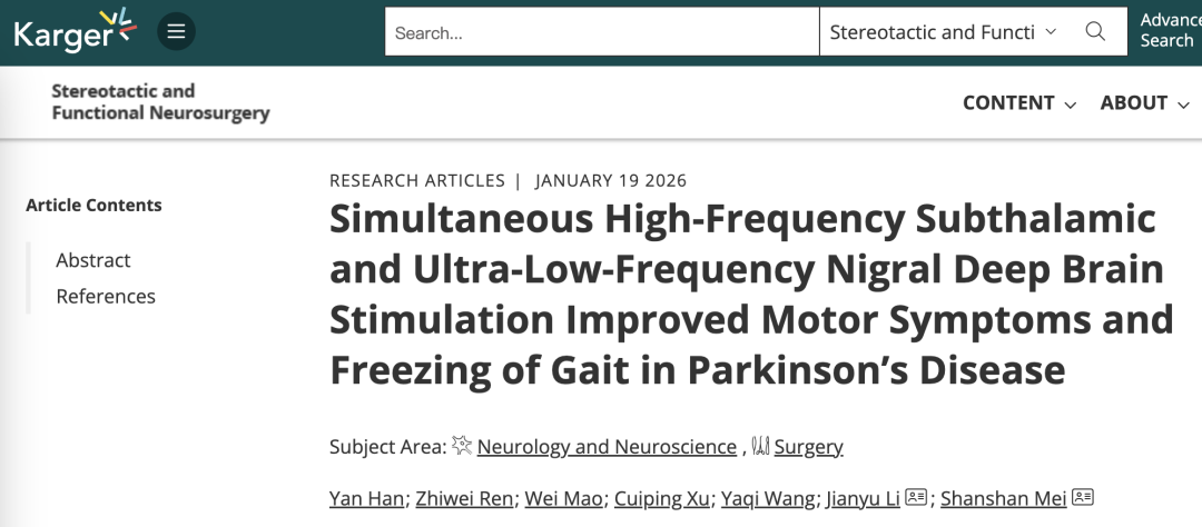 2026年1月19日,首都医科大学宣武医院神经外科李建宇、神经内科梅珊珊等团队在功能神经外科权威期刊 《Stereotactic and Functional Neurosurgery》 (JCR Q1)在线发表了题为“Simultaneous high-frequency subthalamic and ultra-low-frequency nigral deep brain stimulation improved motor symptoms and freezing of gait in Parkinson’s Disease”的研究成果,证实了高频丘脑底核联合超低频黑质网状部的双靶点脑深部电刺激,可显著改善帕金森病冻结步态与运动症状。
