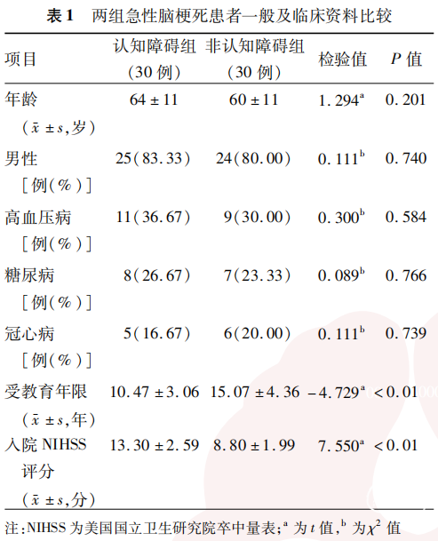 共纳入急性脑梗死患者60例,男49例,女11例,年龄30~79岁,平均(62±11)岁。其中,认知障碍组30例,非认知障碍组30例。