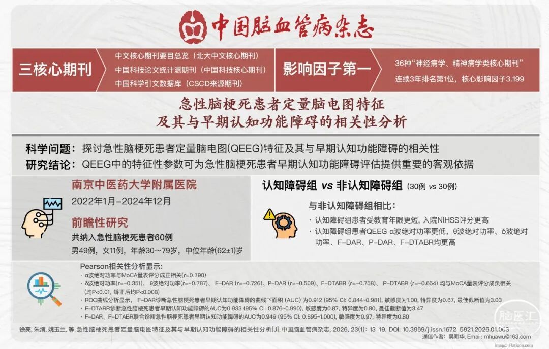 摘要:目的探讨急性脑梗死患者定量脑电图(QEEG)特征及其与早期认知功能障碍的相关性。方法前瞻性连续纳入2022年1月至2024年12月南京中医药大学附属医院神经内科收治的急性脑梗死患者。收集患者的一般及临床资料,包括年龄、性别、高血压病、糖尿病、冠心病、入院美国国立卫生研究院卒中量表(NIHSS)评分、受教育年限。依据患者入院第2天蒙特利尔认知评估(MoCA)量表评分并校正受教育年限,将所有患者分为认知障碍组(MoCA量表评分< 26分)及非认知障碍组(MoCA量表评分≥ 26分)。入院第2天采集并定量分析所有患者QEEG参数,包括α波、θ波、β波、δ波绝对功率值、额区δ波绝对功率与α波绝对功率比值(F-DAR)、额区δ波绝对功率与θ波绝对功率之和与α波绝对功率与β波绝对功率之和的比值(F-DTABR)、后头部δ波绝对功率与α波绝对功率比值(P-DAR)、后头部δ波绝对功率与θ波绝对功率之和与α波绝对功率与β波绝对功率之和的比值(P-DTABR)。采用Pearson相关性分析评估QEEG参数与MoCA量表评分的相关性,0.7≤|r|<0.9为二者存在高相关性,0.9≤|r|<1.0为二者存在极高相关性。采用受试者工作特征(ROC)曲线评估与MoCA量表评分存在高相关性和极高相关性的复合QEEG参数对急性脑梗死患者早期认知功能障碍的诊断价值。结果共纳入急性脑梗死患者60例,男49例,女11例,年龄30~79岁,平均(62±11)岁。其中,认知障碍组30例,非认知障碍组30例。(1)与非认知障碍组相比,认知障碍组患者受教育年限更短[(10.47±3.06)年比(15.07±4.36)年],入院NIHSS评分更高[(13.30±2.59)分比(8.80±1.99)分;均P<0.01],余一般及临床资料的组间差异均无统计学意义(均P>0.05)。(2)与非认知障碍组相比,认知障碍组患者QEEGα波绝对功率更低[(6.35±0.41)μV2比(7.70±0.39)μV2, P<0.01],θ波绝对功率[(14.72 ± 0.85)μV2比(13.13±0.34)μV2]、δ波绝对功率[(25.38±2.03)μV2比(23.28 ± 3.87)μV2]、F-DAR(3.94±0.47比2.95 ± 0.51)、P-DAR(4.10±0.60比3.28 ± 0.49)、F-DTABR(3.83±0.30比3.01 ± 0.47)、P-DTABR(3.94±0.35比3.22 ± 0.33)均更高(均P<0.05)。(3)Pearson相关性分析显示,α波绝对功率与MoCA量表评分成正相关(r=0.790),θ波绝对功率(r=-0.787)、δ波绝对功率(r=-0.351)、F-DAR(r=-0.726)、P-DAR(r=-0.509)、F-DTABR(r=-0.758)、P-DTABR(r= -0.654)均与MoCA量表评分成负相关(均P<0.01,校正后均P<0.008),其中α波及θ波绝对功率、F-DAR、F-DTABR与MoCA量表评分高度相关。(4)ROC曲线分析显示,F-DAR诊断急性脑梗死患者早期认知功能障碍的曲线下面积(AUC)为0.912(95%CI:0.844~0.981),敏感度为1.00,特异度为0.67,最佳截断值为3.03,F-DTABR诊断急性脑梗死患者早期认知功能障碍的AUC为0.933(95%CI: 0.876~0.990),敏感度为0.87,特异度为0.80,最佳截断值为3.47。F-DAR、F-DTABR联合诊断急性脑梗死患者早期认知功能障碍的AUC为0.949(95% CI: 0.895~1.000),敏感度为0.97,特异度为0.80。结论QEEG中的特征性参数可为急性脑梗死患者早期认知功能障碍评估提供重要的客观依据。