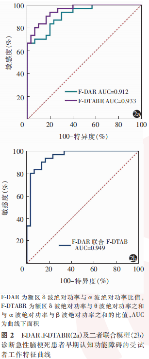 此外,一项研究纳入了24例首次发病的缺血性卒中患者,并基于单个前额叶电极生成的数据进行分析,结果显示,δ波绝对功率(r=-0.47,P=0.02)、DAR(r=-0.45,P= 0.03)和δ波绝对功率与θ波绝对功率比值(delta/theta ratio, DTR;r=-0.57,P= 0.01)等QEEG参数可能有利于评估缺血性卒中患者发病后90d认知障碍(MoCA量表评分<26分),且DTR是缺血性卒中后90d认知障碍的潜在标志物(β=-0.36, P<0.05)[26]。本研究结果显示,QEEG F-DAR及F-DTABR与患者的MoCA量表评分成高度负相关,提示患者F-DAR及F-DTABR值越高,其认知功能越差,这可能是由于认知障碍组额区的α频段功率谱值低于非认知障碍组,且θ频段功率谱值高于非认知障碍组。由于患者脑梗死部位的差异可能对认知功能产生不同影响,且脑电信号干扰因素较多,因此使用复合指标相较于绝对功率值在脑梗死后认知功能评估方面可能更具稳定性和可比性。本研究结果显示,F-DAR诊断急性脑梗死患者早期认知功能障碍的AUC为0.912(95% CI:0.844~0.981),F-DTABR诊断急性脑梗死患者早期认知功能障碍的AUC为0.933(95%CI:0.876~0.990),二者联合诊断早期认知功能障碍的AUC为0.949(95%CI:0.895~1.000),提示F-DAR及F-DTABR或可为急性脑梗死患者认知功能障碍的早期筛查提供一定的客观依据。