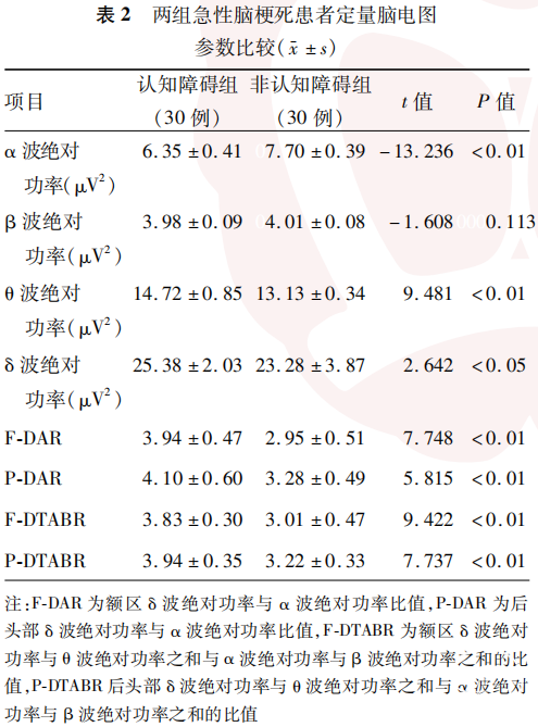 急性脑梗死是临床常见的卒中类型,也是我国常见的脑血管病致死病因[1]。25%~30%的急性脑梗死患者可迅速或延迟进展为认知功能障碍或痴呆,超过70%的急性脑梗死幸存者存在认知缺损[2]。有研究显示,患者卒中发病后2周内认知功能障碍的发生率为24.5%~34.7%[3],约80%的卒中患者在发病6个月内出现认知功能损伤[4]。目前临床上评价认知功能障碍常用的神经心理学评估量表包括简易精神状态检查量表和蒙特利尔认知评估(Montreal cognitive assessment, MoCA)量表,但这些量表并非专门为卒中后认知筛查而设计,部分卒中患者因出现语言、视觉等功能障碍无法完成评估,且量表评分存在一定的主观性。脑电图异常是脑梗死后的典型表现之一,脑梗死后脑血流量减少,皮质神经元代谢过程和电生理活动均出现相应改变[5]。脑电图可在脑功能发生异常变化早期阶段显示其相应的电活动改变,甚至在临床症状尚未完全显现之前出现异常波形,从而实现对脑梗死的早期预警[6]。定量脑电图(quantitative electroencephalography, QEEG)作为一种无创、便捷且可重复操作的神经生理学检测手段,在脑梗死的诊断与监测中发挥着重要作用[7]。近年来,人工智能、脑机接口等技术大力发展,QEEG在认知功能评估中的作用再次成为认知领域的研究热点[8]。本研究拟通过分析急性脑梗死患者QEEG参数,探讨其与急性脑梗死患者早期认知功能障碍的相关性,以期为急性脑梗死患者早期认知功能障碍的识别提供客观、可量化的神经电生理学标志物。