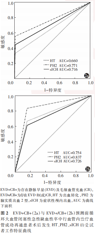 ROC曲线分析显示,EVD+CB+预测前循环LVO-AIS患者行EVT血管成功再通后发生HT、PH2及sICH的AUC分别为0.660、0.771和0.716。见图2a,表3。EVD+/CB+预测前循环LVO-AIS患者行EVT血管成功再通后发生HT、PH2及sICH的AUC分别为0.754、0.837和0.726。见图2b,表3。