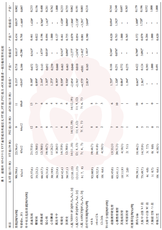 对于发病时间在4.5h内具有静脉溶栓适应证的患者应用重组组织型纤溶酶原激活剂(0.9mg/kg,最大剂量90mg,先静脉注射总剂量的10%,剩余90%静脉滴注,共持续1h)并行桥接治疗。术前完成头部CTA或MRA检查,结合影像学特征和临床症状评估患者情况,以确定介入路径和个体化的血管开通策略。患者全身麻醉后首选股动脉入路,置入动脉鞘后,静脉团注肝素(50U/kg)肝素化后以1000U/h追加。疑似大负荷、质韧血栓导致的动脉闭塞和(或)外院静脉溶栓治疗效果欠佳的患者,获得家属知情同意后行急诊机械取栓治疗;对明确为动脉粥样硬化性急性闭塞患者首选直接血管成形术,包括支架置入和(或)球囊扩张;对取栓治疗后残余狭窄率≥ 70%的原位狭窄且围手术期再闭塞风险高的患者行补救性血管成形术。以术后即刻mTICI分级≥2b级为血管成功再通。术中和(或)术后静脉内注射负荷量盐酸替罗非班10μg/kg,再以0.1μg/(kg·min)静脉泵注至少12h,之后根据患者情况个体化调整抗血小板聚集治疗方案。在停用盐酸替罗非班前3h,予口服负荷量氯吡格雷300mg,停用盐酸替罗非班次日,若无禁忌证则予以口服阿司匹林100mg/d+氯吡格雷75mg/d双联抗血小板聚集治疗,1~3个月后调整为长期单抗药物治疗。所有患者术后即刻行头部血管造影CT排查出血并发症,术后72h内复查头部CT及MRI分别评估是否发生HT及脑梗死灶大小。