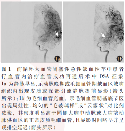 将血管成功再通后DSA动脉晚期或毛细血管期(对侧半球或同侧未受累区域的正常静脉尚未显影时)缺血区域脑组织内出现皮质或深部引流静脉提前显影定义为EVD(图1a),该征象提示局部可能存在动静脉分流或毛细血管床水平调节功能障碍[31-32]。CB为血管成功再通后DSA毛细血管期基底节区(如豆状核、纹状体区)出现局灶性、均匀的“毛玻璃样”或“云雾状”对比剂浓聚,其密度明显高于同侧大脑中动脉或大脑前动脉供血区的正常皮质毛细血管染色,且显影时间略早并呈现排空延迟(图1b),该征象提示局部血-脑屏障破坏与微血管床淤血[14,33]。