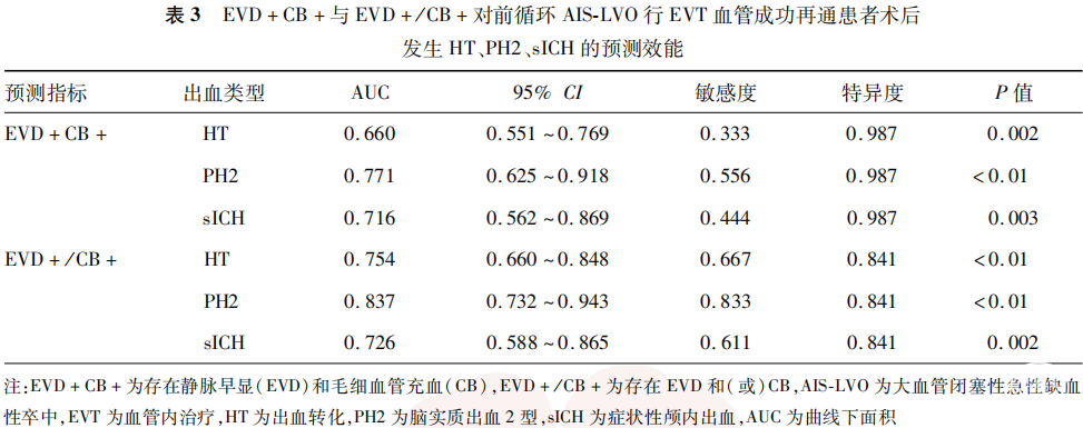 本研究HT患者中EVD-CB+的患者比例高于无HT患者[28.2%(11/39)比12.6%(19/151),P=0.017],但EVD+CB-患者比例在HT和无HT患者中差异无统计学意义(P>0.05),这可能与HT患者样本量少有关;此外,尽管本研究中PH2和sICH患者例数均较少,但EVD+CB+在PH2和sICH患者中的比例均高于无HT患者(均P<0.05),多因素Logistic回归分析显示,前循环AIS-LVO患者行EVT血管成功再通后术中DSAEVD+CB+是术后发生HT、PH2及sICH的独立危险因素(均P<0.05);EVD+CB+和EVD+/CB+对术后发生HT、PH2及sICH均具有一定的预测效能,表明EVD和CB不仅对预测前循环AIS-LVO行EVT血管成功再通后的出血风险具有重要价值,也是预测严重出血事件的特异性影像学标志物。