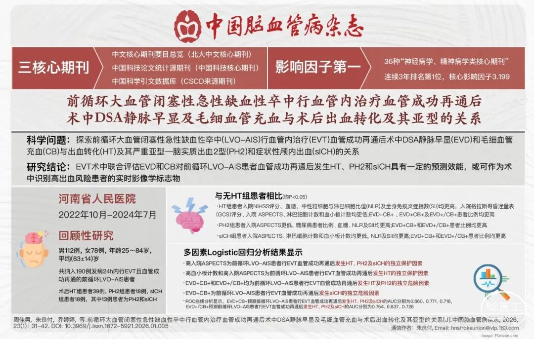 摘要:目的探索前循环大血管闭塞性急性缺血性卒中(LVO-AIS)行血管内治疗(EVT)血管成功再通后术中DSA静脉早显(EVD)和毛细血管充血(CB)与出血转化(HT)及其严重亚型——脑实质出血2型(PH2)和症状性颅内出血(sICH)的关系。方法回顾性连续纳入2022年10月至2024年7月河南省人民医院脑血管病科收治的发病24h内行EVT且血管成功再通[术后即刻改良脑梗死溶栓(mTICI)分级≥2b级]的前循环LVO-AIS患者。收集患者的一般及临床资料,包括性别、年龄、高血压病、糖尿病、高脂血症、冠心病、心房颤动、吸烟史、饮酒史、既往卒中、入院美国国立卫生研究院卒中量表(NIHSS)评分、入院格拉斯哥昏迷量表(GCS)评分、入院Alberta卒中项目早期CT评分(ASPECTS)、急性卒中治疗Org10172试验(TOAST)分型(动脉粥样硬化型、心源性栓塞型、其他病因型、不明原因型)、治疗时间窗[发病至穿刺时间(OPT)≤6h,>6~< 12h,12~24h]、闭塞部位(颈内动脉、大脑中动脉M1段或M2段、大脑前动脉A1段、串联闭塞)、术前静脉溶栓、血管开通技术(机械取栓、直接血管成形、机械取栓+补救血管成形)、OPT、穿刺至血管成功再通时间、发病至血管成功再通时间及入院血液检查指标[中性粒细胞、淋巴细胞计数、血小板计数、纤维蛋白原、血糖、中性粒细胞与淋巴细胞比值(NLR)、全身免疫炎症指数(SII)]。血管成功再通后DSA中存在EVD为EVD+,不存在EVD为EVD-,存在CB为CB+,不存在CB为CB-,存在EVD但不存在CB为EVD+CB-,不存在EVD但存在CB为EVD-CB+,存在EVD和CB为EVD+CB+,存在EVD和(或)CB为EVD+/CB+。术后72h行CT评估是否发生HT、PH2和sICH。不存在颅内出血的患者为无HT组;存在任何类型颅内出血的患者为HT组;血肿体积>梗死体积的30%,并存在明显占位效应的出血或远离梗死灶出血的患者为PH2组;sICH为存在任何形式的颅内出血且伴随神经功能恶化(NIHSS评分较基线增加≥4分或NIHSS中任意一项评分较基线增加≥2分)的患者为sICH组。将无HT组与其他3组比较差异有统计学意义的因素采用逐步向前回归筛选变量并进行多因素Logistic回归分析,分析前循环LVO-AIS患者EVT术后72h发生HT、PH2和sICH的影响因素。绘制受试者工作特征(ROC)曲线并计算曲线下面积(AUC),评估EVD+CB+与EVD+/CB+对HT、PH2及sICH的预测效能。结果共纳入190例行EVT后血管成功再通的前循环LVO-AIS患者,男112例,女78例,年龄25~84岁,平均(63±14)岁。术后HT组患者39例(20.5%),PH2组患者18例(9.5%),sICH组患者18例(9.5%),其中13例(6.8%)患者为PH2和sICH。术后即刻DSA显示EVD+患者20例(10.5%),CB+患者45例(23.7%),EVD+CB-患者5例(2.6%), EVD-CB+患者30例(15.8%),EVD+CB + 患者15例(7.9%)。(1)与无HT组患者相比,HT组患者入院NIHSS评分、血糖、NLR及SII均更高,入院GCS评分、入院ASPECTS、淋巴细胞计数和血小板计数均更低,EVD-CB+、EVD+CB+及EVD+/CB+患者比例均更高(均P<0.05),余一般及临床资料的组间差异均无统计学意义(均P>0.05);与无HT组患者相比,PH2组患者入院ASPECTS更低,糖尿病患者比例、血糖NLR及SII均更高,EVD+CB+和EVD+/CB+患者比例均更高(均P<0.05),余一般及临床资料的组间差异均无统计学意义(均P>0.05);与无HT组相比,sICH组患者入院ASPECTS、淋巴细胞计数和血小板计数均更低,NLR、SII均更高,EVD+CB + 和EVD+/CB+患者比例均更高(均P<0.01),余一般及临床资料的组间差异均无统计学意义(均P>0.05)。(2)多因素Logistic回归分析结果显示,高血小板计数(OR=0.992,95%CI:0.985 ~ 0.999,P=0.022)和高入院ASPECTS (OR=0.607,95% CI:0.424~0.871,P= 0.007)为前循环LVO-AIS患者行EVT血管成功再通后发生HT的独立保护因素,EVD+CB+ (OR=8.664, 95% CI: 1.533~48.953,P=0.015)及EVD+/CB+(OR=5.866,95% CI:2.261~15.217,P< 0.01)均为前循环LVO-AIS患者行EVT血管成功再通后发生HT的独立危险因素;高入院ASPECTS(OR=0.595,95% CI: 0.362~0.975,P=0.039)为前循环LVO-AIS患者行EVT血管成功再通后发生PH2的独立保护因素,EVD+CB+(OR=25.450,95% CI: 3.719~174.158, P<0.01)和EVD+/CB+ (OR=7.747,95% CI:1.664~36.066,P= 0.009)为前循环LVO-AIS患者行EVT血管成功再通后发生PH2的独立危险因素;高入院ASPECTS为前循环LVO-AIS患者行EVT血管成功再通后发生sICH的独立保护因素(OR=0.563,95% CI:0.357~0.888,P= 0.014),EVD+CB+为前循环LVO-AIS患者行EVT血管成功再通后发生sICH的独立危险因素(OR=52.576,95% CI: 7.866~351.432,P<0.01)。(3)ROC曲线分析显示,EVD+CB+预测前循环LVO-AIS患者行EVT血管成功再通后发生HT、PH2及sICH的AUC分别为0.660、0.771和0.716;EVD+/CB+预测前循环LVO-AIS患者行EVT血管成功再通后发生HT、PH2及sICH的AUC分别为0.754、0.837和0.726。结论EVT术中联合评估EVD和CB对前循环LVO-AIS患者血管成功再通后发生HT、PH2和sICH具有一定的预测效能,或可作为术中识别高出血风险患者的实时影像学标志物。