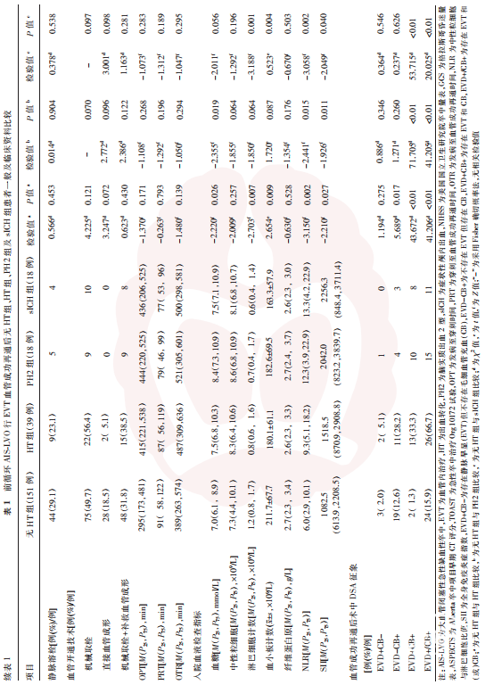 以血管成功再通后术中DSA中存在EVD为EVD+,不存在EVD为EVD-,存在CB为CB+,不存在CB为CB-,存在EVD但不存在CB为EVD+CB-,不存在EVD但存在CB为EVD-CB+,存在EVD和CB为EVD+CB+,存在EVD和(或)CB为EVD+/CB+。所有血管成功再通后的术中DSA影像由2名不知晓患者术后影像学结果及临床结局的副主任医师及以上的神经介入医师独立进行分析,意见不一致时通过协商达成共识。