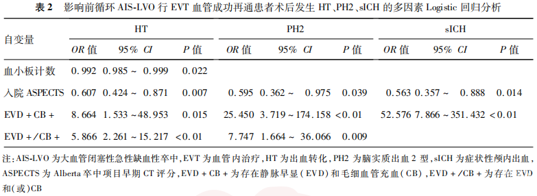 高入院ASPECTS为前循环LVO-AIS患者行EVT血管成功再通后发生PH2的独立保护因素,EVD+CB+和EVD+/CB+为前循环LVO-AIS患者行EVT血管成功再通后发生PH2的独立危险因素。见表2。