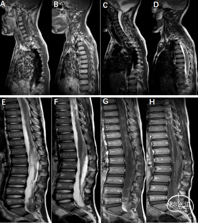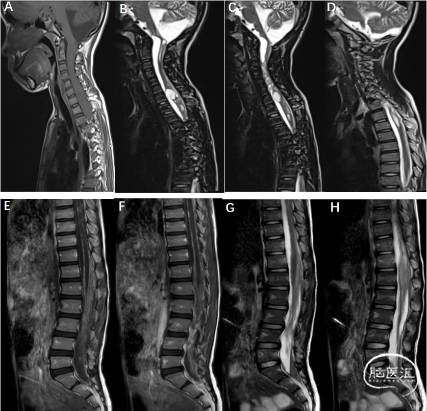 E-H:胸12-腰1水平马尾神经冗余,增强后强化不均;椎管内脑脊液信号T1WI与脊髓信号相当,腰髓受压后移,局部包绕马尾终丝。胸段脊膜不规则增厚。影像学诊断:胸12-腰1水平马尾神经冗余,胸腰段脊膜炎伴硬膜下积脓