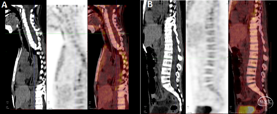 A-B:延髓及颈髓前方条状低密度影,伴少许FDG摄取;颈髓及下胸段脊髓FDG摄取下降;腰段椎管腔内弥漫性少许FDG摄取,可符合感染性病变可能