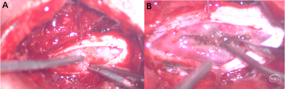 3. 铣刀将C6-C7棘突椎板铣开,见硬脊膜囊饱满,纵向切开硬脊膜囊,见软脊膜增厚,下方可见黄色分泌物。
