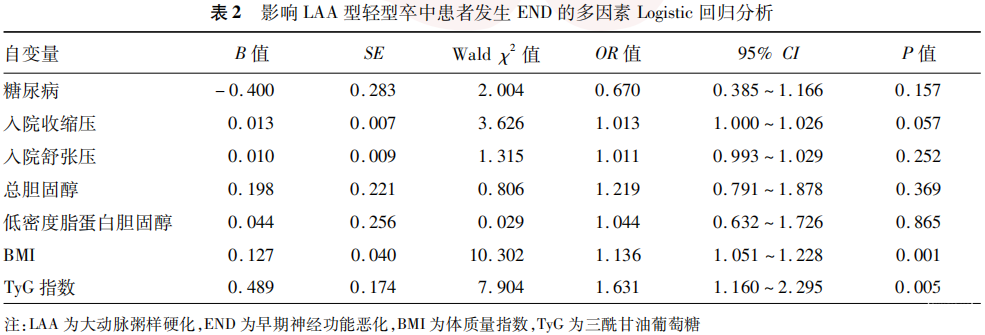 排除空腹血糖、三酰甘油后,多因素Logistic回归分析结果显示,BMI(OR= 1.136,95% CI:1.051~1.228)、TyG指数(OR=1.631, 95% CI:1.160~2.295)是LAA型轻型卒中发生END的独立危险因素(均P<0.05)。见表2。