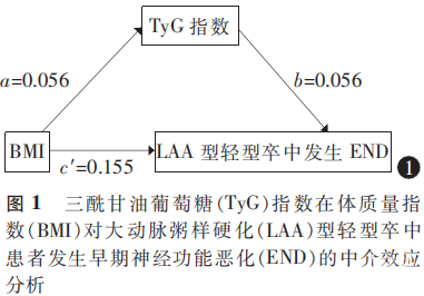 采用Bootstrap方法分析TyG指数是否介导BMI和LAA型轻型卒中发生END之间的关联;若总效应(c)、自变量(BMI)对中介变量(TyG指数)的效应(a)、中介变量(TyG指数)对因变量(LAA型轻型卒中发生END)的效应(b)及间接效应(95%CI不包含0)均有统计学意义,则中介效应成立。若间接效应95%CI包含0,则表示无中介效应。在满足中介效应成立的基础条件下,控制中介变量TyG指数,若BMI对LAA型轻型卒中患者发生END的直接效应系数c′有统计学意义,则部分中介效应成立。以P<0.05为差异有统计学意义。