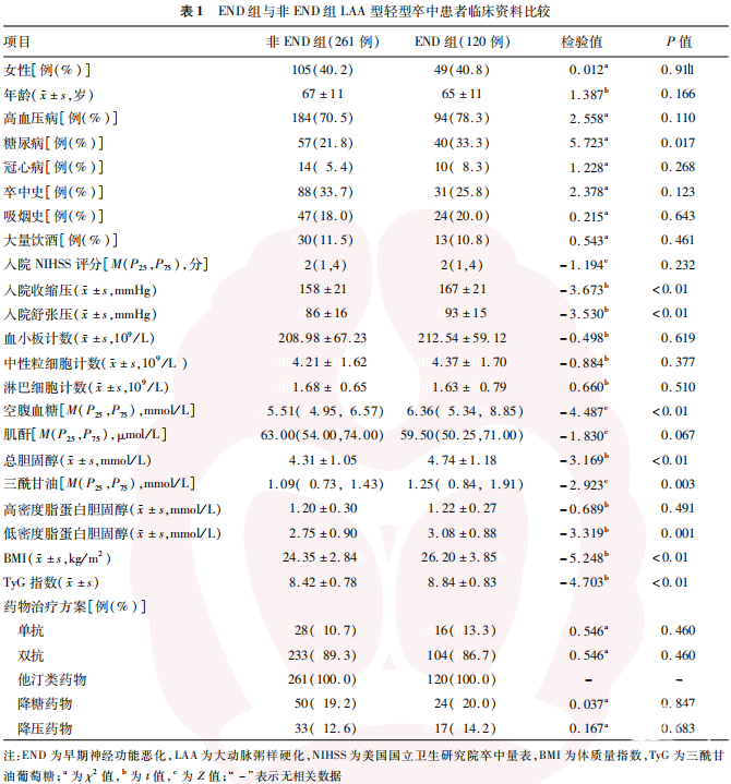 共纳入381例LAA型轻型卒中患者,男227例,女154例,年龄34~94岁,平均(66±11)岁,其中END组120例,非END组261例。
