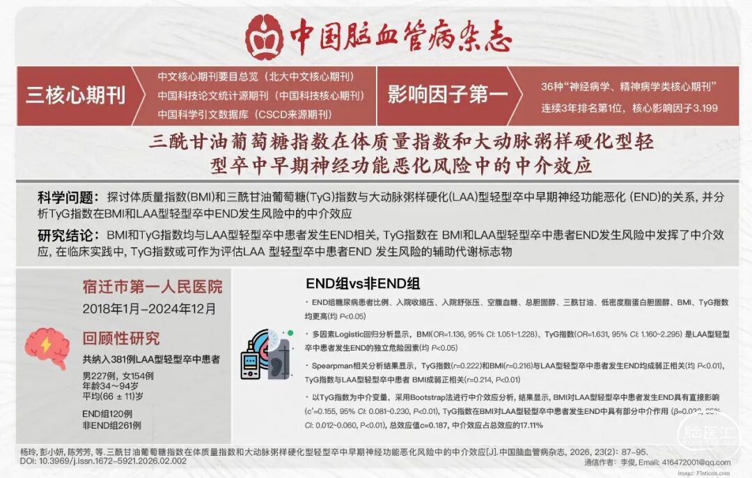 摘要:目的探讨体质量指数(BMI)和三酰甘油葡萄糖(TyG)指数与大动脉粥样硬化(LAA)型轻型卒中早期神经功能恶化(END)的关系,并分析TyG指数在BMI和LAA型轻型卒中END发生风险中的中介效应。方法回顾性连续纳入2023年1月至2025年7月宿迁市第一人民医院神经内科收治的LAA型轻型卒中[入院时美国国立卫生研究院卒中量表(NIHSS)评分≤5分]患者。收集患者的临床资料,包括性别、年龄、BMI、入院血压(收缩压、舒张压)、脑血管危险因素[高血压病、糖尿病、冠心病、卒中史、吸烟史(吸烟定义为每天至少吸1支烟,持续时间≥1年)、大量饮酒(乙醇摄入量≥24g/d)]、入院时NIHSS评分。入院后24h内采集空腹血样行实验室检查,包括血小板计数、中性粒细胞计数、淋巴细胞计数、空腹血糖、肌酐、总胆固醇、三酰甘油、高密度脂蛋白胆固醇、低密度脂蛋白胆固醇。入院72h内药物治疗方案包括单抗、双抗、他汀类药物、降压药物、降糖药物。TyG指数=ln[空腹三酰甘油(mg/dl)×空腹血糖(mg/dl)/2],其中三酰甘油(mg/dl)=三酰甘油(mmol/L) × 88.57,空腹血糖(mg/dl)=空腹血糖(mmol/L)×18.02。END定义为急性缺血性卒中发病后72h内NIHSS评分较入院时增加≥2分或运动评分增加≥1分,根据是否发生END将所有患者分为END组和非END组。比较两组患者的临床资料,并将差异有统计学意义的变量纳入多因素Logistic回归分析,探索LAA型轻型卒中发生END的独立危险因素。采用Spearman相关性分析分别探究BMI、TyG指数与LAA型轻型卒中患者发生END的相关性及BMI与TyG指数的相关性,以0.8≤|r|<1.0为极强相关,0.6≤|r|< 0.8为强相关,0.4≤|r|<0.6为中等相关,0.2≤|r|<0.4为弱相关,0<|r|<0.2为极弱相关。采用Bootstrap方法分析TyG指数是否介导BMI和LAA型轻型卒中发生END之间的关联;若总效应(c)、自变量(BMI)对中介变量(TyG指数)的效应(a)、中介变量(TyG指数)对因变量(LAA型轻型卒中发生END)的效应(b)及间接效应(95%CI不包含0)均有统计学意义,则中介效应成立。若间接效应95%CI包含0,则表示无中介效应。在满足中介效应成立的基础条件下,控制中介变量TyG指数,若BMI对LAA型轻型卒中患者发生END的直接效应系数c′有统计学意义(P<0.05),则部分中介效应成立。结果共纳入381例LAA型轻型卒中患者,男227例,女154例,年龄34~94岁,平均(66±11)岁,其中END组120例,非END组261例。(1)与非END组比较,END组糖尿病患者比例[33.3%(40/120)比21.8%(57/261)]、入院收缩压[(167±21)mmHg比(158 ± 21)mmHg]、入院舒张压[(93±15)mmHg比(86±16)mmHg]、空腹血糖[6.36(5.34, 8.85)mmol/L比5.51(4.95, 6.57)mmol/L]、总胆固醇[(4.74 ± 1.18)mmol/L比(4.31±1.05)mmol/L]、三酰甘油[1.25(0.84,1.91)mmol/L比1.09(0.73,1.43)mmol/L]、低密度脂蛋白胆固醇[(3.08±0.88)mmol/L比(2.75 ± 0.90)mmol/L]、BMI[(26.20 ± 3.85)kg/m2比(24.35±2.84)kg/m2]、TyG指数(8.84±0.83比8.42±0.78)均更高(均P<0.05)。(2)排除空腹血糖、三酰甘油,多因素Logistic回归分析结果显示,BMI(OR=1.136,95%CI:1.051~1.228)、TyG指数(OR=1.631,95%CI:1.160 ~ 2.295)是LAA型轻型卒中患者发生END的独立危险因素(均P<0.05)。(3)Spearman相关性分析结果显示,TyG指数(r=0.222)和BMI(r=0.216)与LAA型轻型卒中患者发生END均成弱正相关(均P<0.01),TyG指数与LAA型轻型卒中患者BMI成弱正相关(r=0.214,P<0.01)。(4)以TyG指数为中介变量,采用Bootstrap法进行中介效应分析,结果显示,BMI对LAA型轻型卒中患者发生END具有直接影响(c′=0.155,95%CI: 0.081~0.230,P<0.01),TyG指数在BMI对LAA型轻型卒中患者发生END中具有部分中介作用(β=0.032,95%CI:0.012 ~ 0.060,P<0.01),总效应值c=0.187,中介效应占总效应的17.11%。结论BMI和TyG指数均与LAA型轻型卒中患者发生END相关,TyG指数在BMI和LAA型轻型卒中患者END发生风险中发挥了中介效应,在临床实践中,TyG指数或可作为评估LAA型轻型卒中患者END发生风险的辅助代谢标志物。