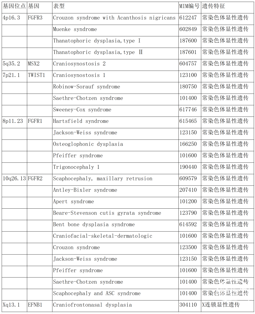 表1. 颅缝早闭部分重要相关基因及其综合征