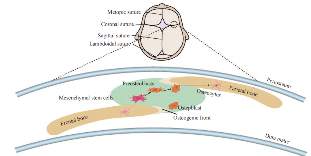 图1: 颅缝间充质中存在颅缝细胞群, 包括颅缝干细胞、前成骨细胞和成骨细胞, 它们不断形成新骨以满足颅骨生长的要求, 并最终分化为骨细胞。