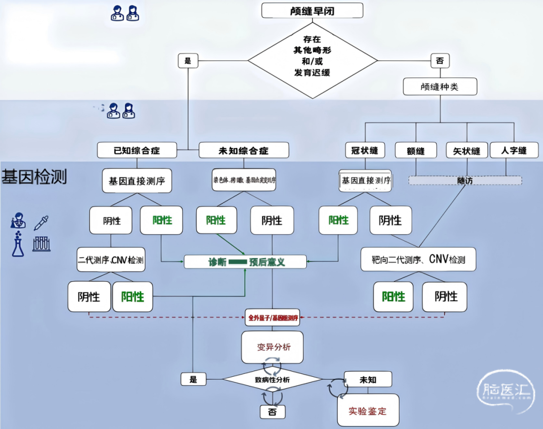 对于综合征型和/或不明确的复杂型CS,基因检测是必需的;而对于非综合征型CS(尤其当可能隐匿遗传形式时,例如累及冠状缝、有家族复发史、或存在细微且易被忽视的认知或躯体异常),则可以采用较为缓和的策略,配合密切随访进行管理。