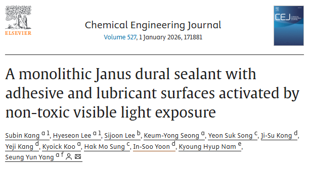 在此背景下,韩国釜山国立大学研究团队成功开发出一种由可见光激活的Janus双面结构硬脑膜补片。该补片可在5秒内完成硬脑膜撕裂的防水密封,有望解决神经外科手术中脑脊液漏的临床难题。相关结果于2026年1月正式发表在《Chemical Engineering Journal》(IF:13.2)上(doi:10.1016/j.cej.2025.171881)。