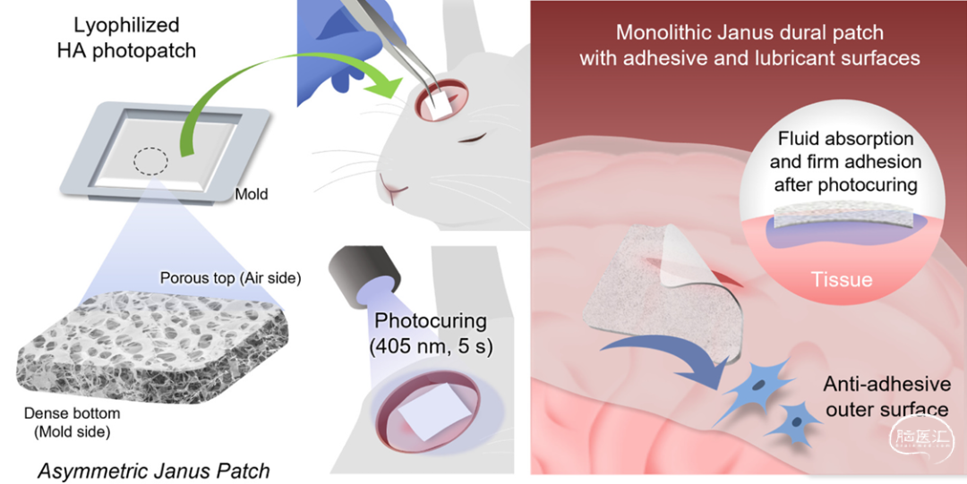 硬脑膜是包裹大脑与脊髓的关键保护层,术中切开或撕裂后易引发脑脊液漏,导致伤口愈合延迟、低颅压性头痛、感染甚至严重并发症(如脑膜炎)。因此,实现严密的硬脑膜闭合是神经外科的核心需求。目前临床以缝合为“金标准”,但存在操作耗时、二次损伤等问题;胶水类密封剂则可能过度膨胀,引发脑部占位效应或组织粘连。传统Janus双面补片多依赖多材料复合,制备工艺复杂,实用性受限。