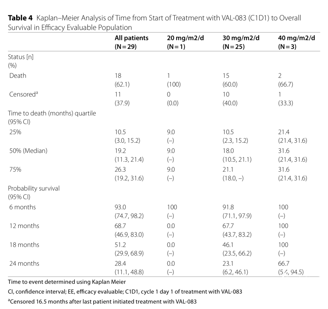 本临床试验(NCT03050736)将全部29例入组患者纳入意向性治疗分析分群。结果发现在截尾日期,自VAL-083治疗开始以来,所有剂量水平的患者整体中位总生存期(OS)为19.2个月,6个月、12个月、18个月和24个月的存活概率分别为93.0%、68.7%、51.2%和28.4%。其中,接受30mg/m²/d VAL-083治疗的患者中,截至数据截尾日期,25例中有15例(60%)死亡,中位生存期为18.0个月。另一方面,VAL-083的药物动力学呈剂量线性关系,输注后2小时的脑脊液(CSF)浓度与血浆浓度相当或更高。