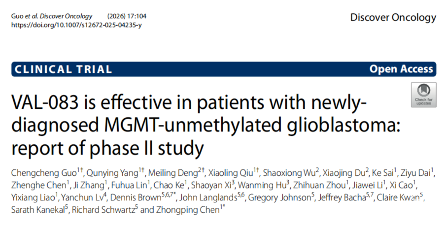 中山大学肿瘤防治中心神经外科的研究团队在这一领域取得新的进展,通过临床试验发现VAL-083(去水卫矛醇)联合放射治疗总体安全且耐受性良好。该治疗方案与标准治疗药物替莫唑胺(TMZ)相比,在疾病进展和总生存期方面展现出潜在获益。相关研究成果以“VAL-083对新诊断的MGMT未甲基化胶质母细胞瘤患者有效:II期临床研究报告”(doi: 10.1007/s12672-025-04235-y.)为题于2025年12月12日发表在《Discover Oncology》。