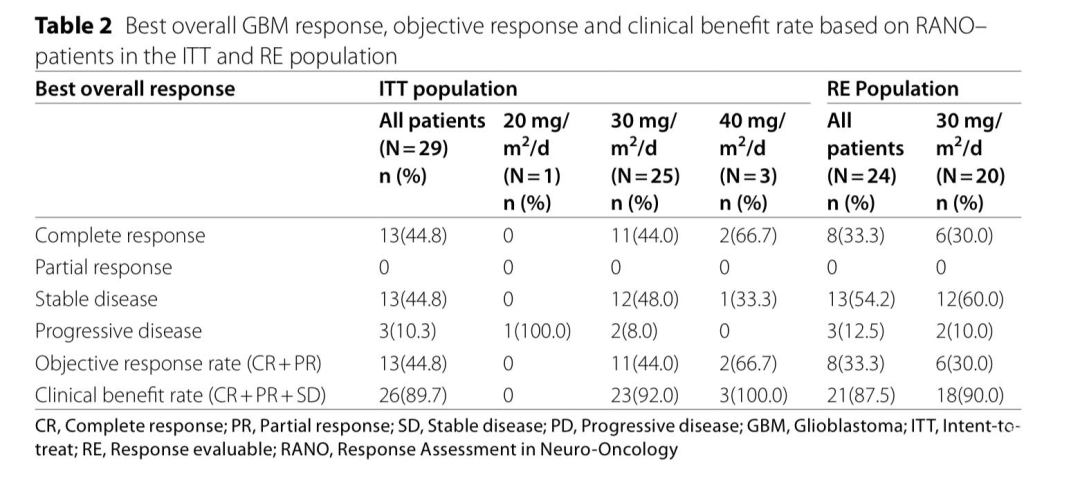 ● 最佳总缓解率显示,44.8%的患者达到完全缓解,44.8%的患者达到疾病稳定。在接受意向治疗剂量30 mg/m²/d的患者中,44%达到完全缓解,48%达到疾病稳定。