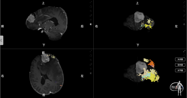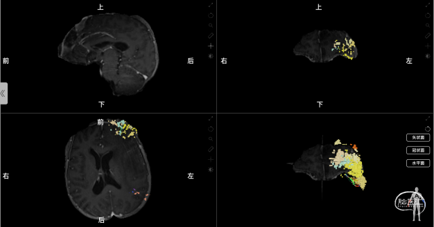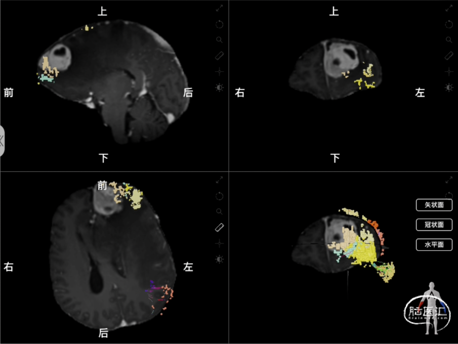 图2 术前使用Nura Surgical重建肿瘤与中央执行网络的关系,中央执行网络显示为黄橙色的彩色体素颗粒和彩色白质纤维束线条组成的整体(左上:矢状位;右上:冠状位;左下:轴位;右下:3D重建。)