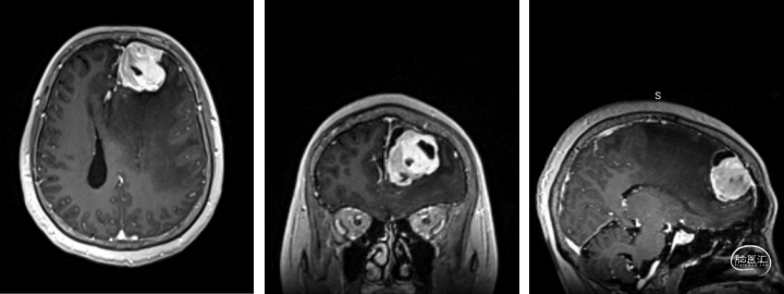 术前增强头颅MRI提示:左侧额叶占位,大小约3.8x3.6x3.9cm,增强扫描呈明显强化,其内见囊变区,伴瘤周水肿,中线结构右偏约1.8cm。考虑肿瘤性病变合并大脑镰下疝形成可能。