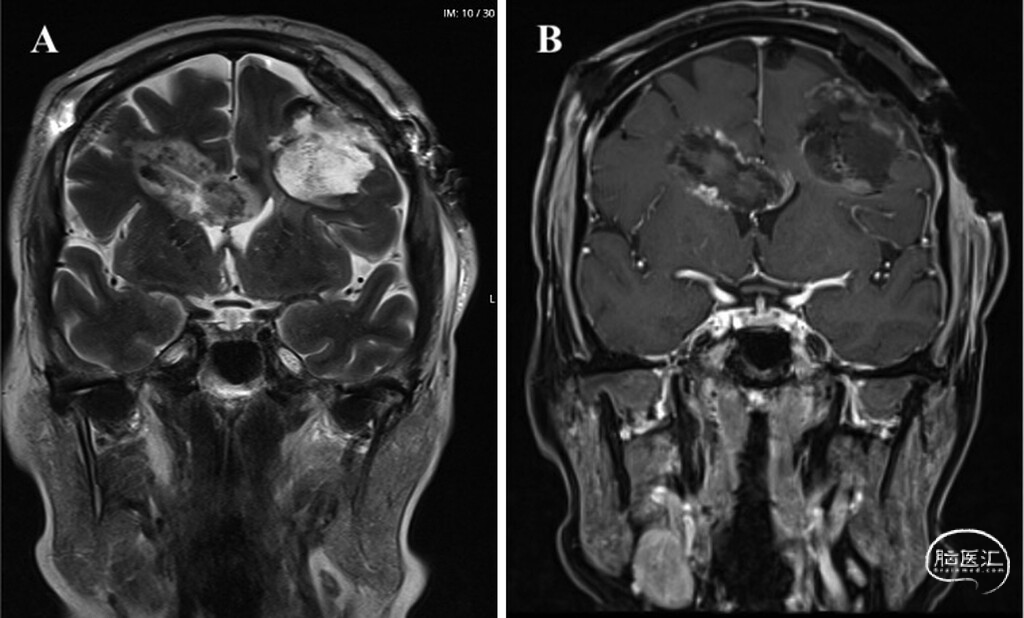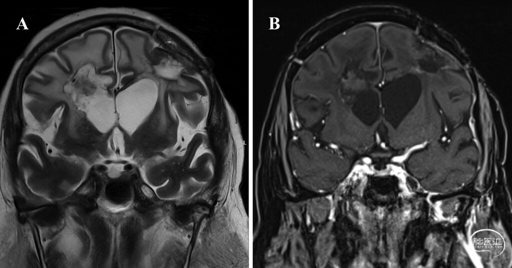 图3:病例1术后MRI,显示肿瘤全切与消融效果。A:冠状位T2加权像可见右侧脑室旁及胼胝体前部病灶已完全消融,可见激光导管通道,左侧额叶病灶术后残腔提示肿瘤完整切除。B:冠状位增强T1加权像显示右侧脑室旁及胼胝体前部病灶完全消融,左侧额叶肿瘤全切,无强化残余肿瘤,证实两处多灶性病变均得到彻底治疗。
