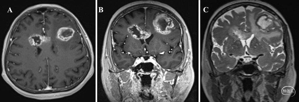 图1:病例1术前MRI,示多灶性GBM。A:轴位增强T1加权像显示左侧额叶有一不均匀强化肿块,右侧脑室旁肿块延伸至胼胝体。B:冠状位增强T1加权像显示左侧额叶不均匀强化病灶伴中央坏死,右侧脑室旁肿块累及胼胝体前部。C:冠状位T2加权像显示多灶性肿块,包括累及右侧胼胝体前部及脑室旁区域的病灶,以及左侧额叶伴瘤周水肿的肿块。