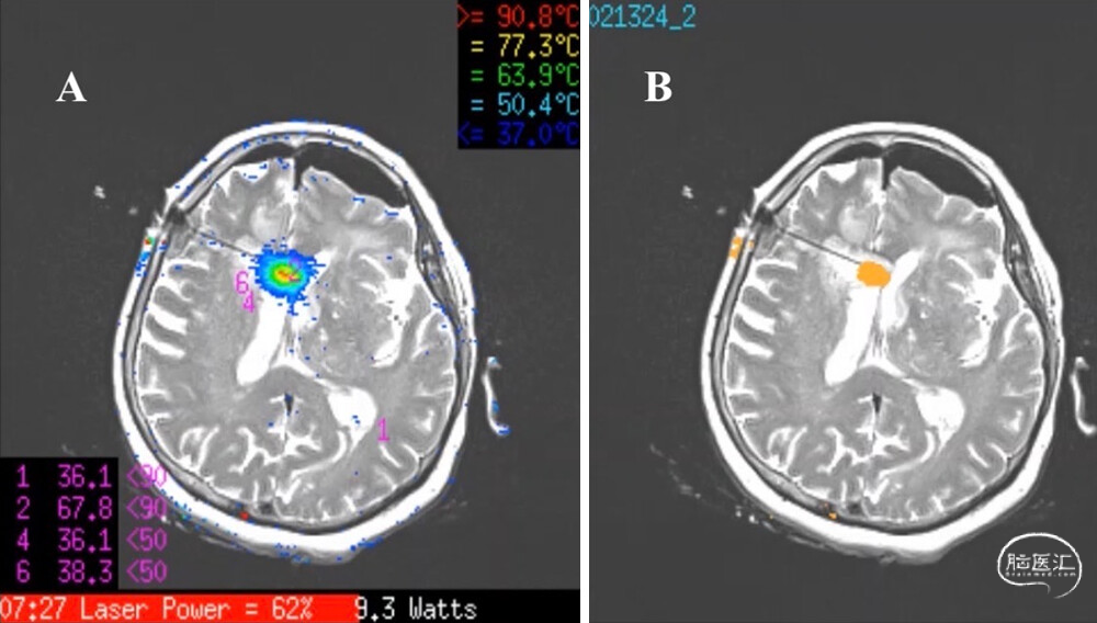 图4:MRI实时测温引导下LITT。A:T2加权像叠加热分布图,显示术中温度分布,红色区域为最大热损伤区,激光导管尖端峰值温度达90.8℃。B:消融完成后的最终热凝固区域。