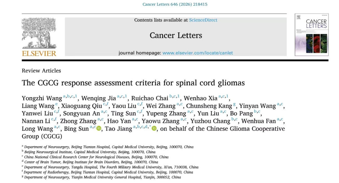 Wang Y, Jia W, Chai R, Xia W, Wang L, Qiu X, Liu Y, Zhang W, Kang C, Wang Y, Liu Y, An S, Sun T, Zhang Y, Liu Y, Pang B, Li N, Zhang Z, Yan H, Zhang Y, Chang Y, Fan W, Wang L, Sun B, Jiang T; Chinese Glioma Cooperative Group (CGCG). The CGCG response assessment criteria for spinal cord gliomas. Cancer Letters. 2026 Mar 6;646:218415. doi: 10.1016/j.canlet.2026.218415. Epub ahead of print. PMID: 41796847.