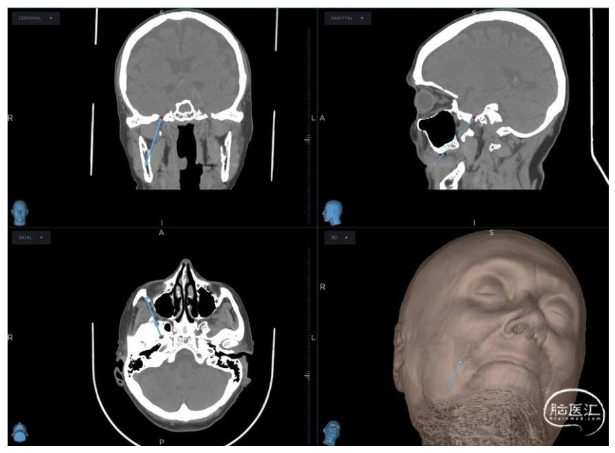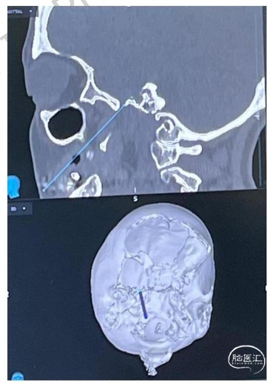 图1:经皮球囊压迫术的术前神经导航规划头颅CT图像,清晰显示靶向卵圆孔的预设穿刺针道(蓝线);三维表面重建可确认皮肤进针点相对于面部标志的位置,从而优化穿刺轨迹、避免骨质碰撞。