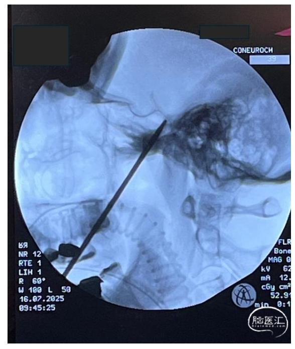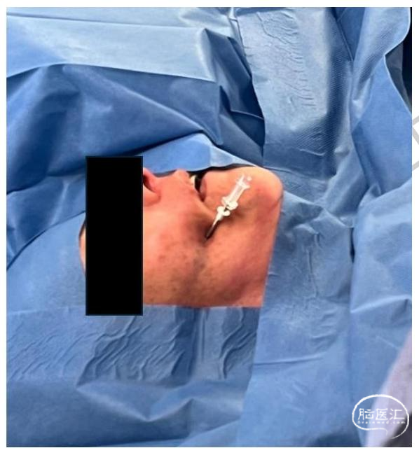 图2:术中视图,经皮穿刺进针点位于口角外侧约2.5 cm处穿刺针固定并沿术前规划路径对准卵圆孔,该位置经神经导航与透视双重确认。此步骤的准确摆放可最大限度减少轨迹调整,并降低黏膜损伤风险。