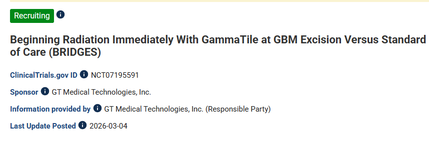 2026年1月14日,GT MedTech公司宣布,针对GammaTile治疗新诊断胶质母细胞瘤(GBM)的BRIDGES III期临床试验(GBM切除术后即刻使用GammaTile放疗vs标准治疗对比研究,NCT07195591)在美国韦斯特切斯特医疗中心与布朗大学医疗中心完成了首批患者入组。