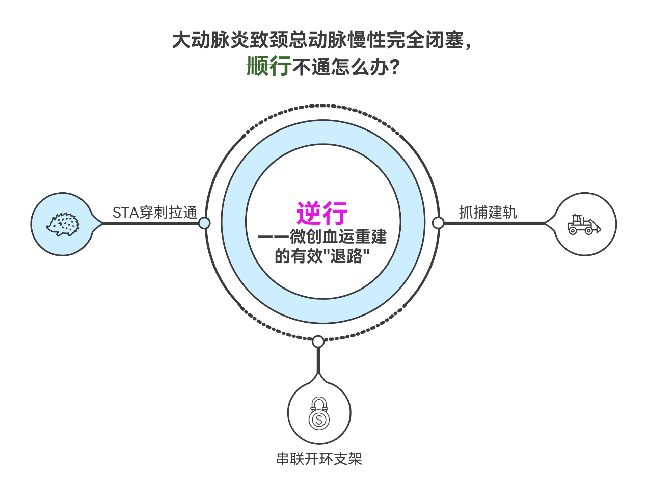 大动脉炎致颈总动脉慢性完全闭塞,顺行不通则逆行——STA切开穿刺、锥束CT导航、12gf探路/40gf穿透、抓捕拉通建轨、串联开环支架,是实现微创血运重建的有效技术路径;但需严格把握手术分序、近端保护限制与围术期抗栓窗口。