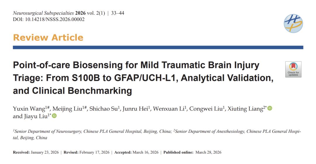 Wang Y, Liu M, Su S, Hei J, Li W, Liu C, et al. Point-of-care Biosensing for Mild Traumatic Brain Injury Triage: From S100B to GFAP/UCH-L1, Analytical Validation, and Clinical Benchmarking. Neurosurgical Subspecialties. 2026;2(1):33-44. doi: 10.14218/NSSS.2026.00002.